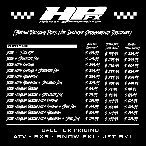 Our pricing reflects premium materials, precision fit, and custom design work, ensuring your bike looks sharp and holds up on the track.